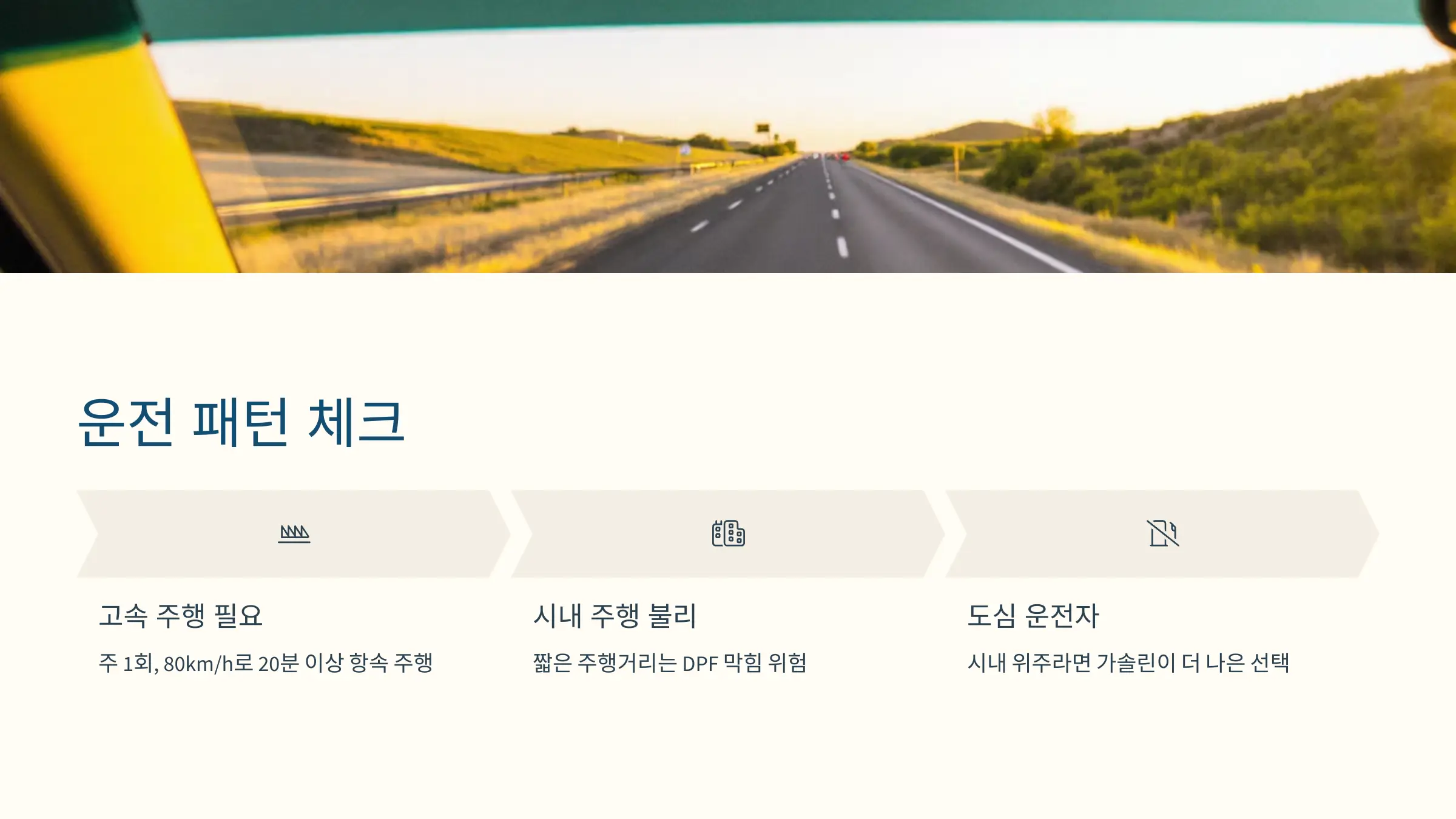 ③ 평소 주행 패턴이 고속도로 중심인지 꼭 돌아보세요. 도심형 운전자라면 가솔린이 더 나은 선택일 수 있습니다.