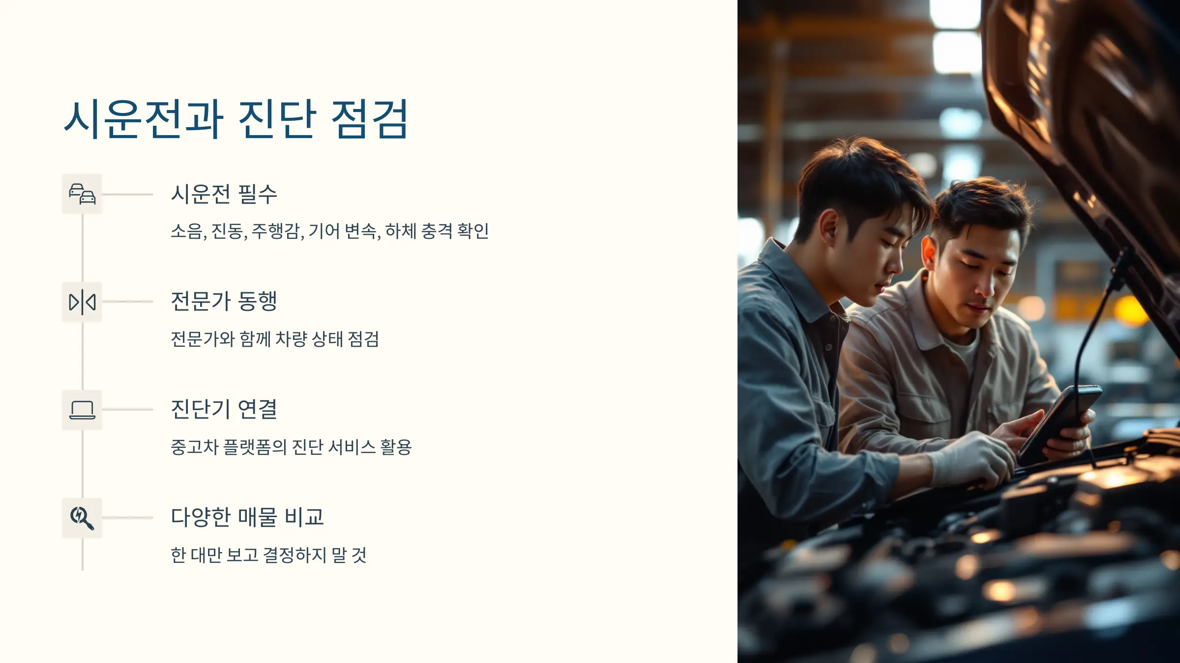 ② 전문가 동행 점검을 요청하거나, 중고차 플랫폼에서 제공하는 진단기 연결 서비스를 활용하는 것도 좋은 방법입니다.