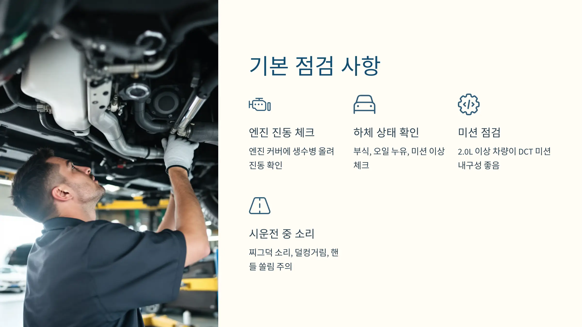 ① 반드시 시운전을 통해 소음, 진동, 주행감, 기어 변속, 하체 충격 등을 종합적으로 판단하세요.
