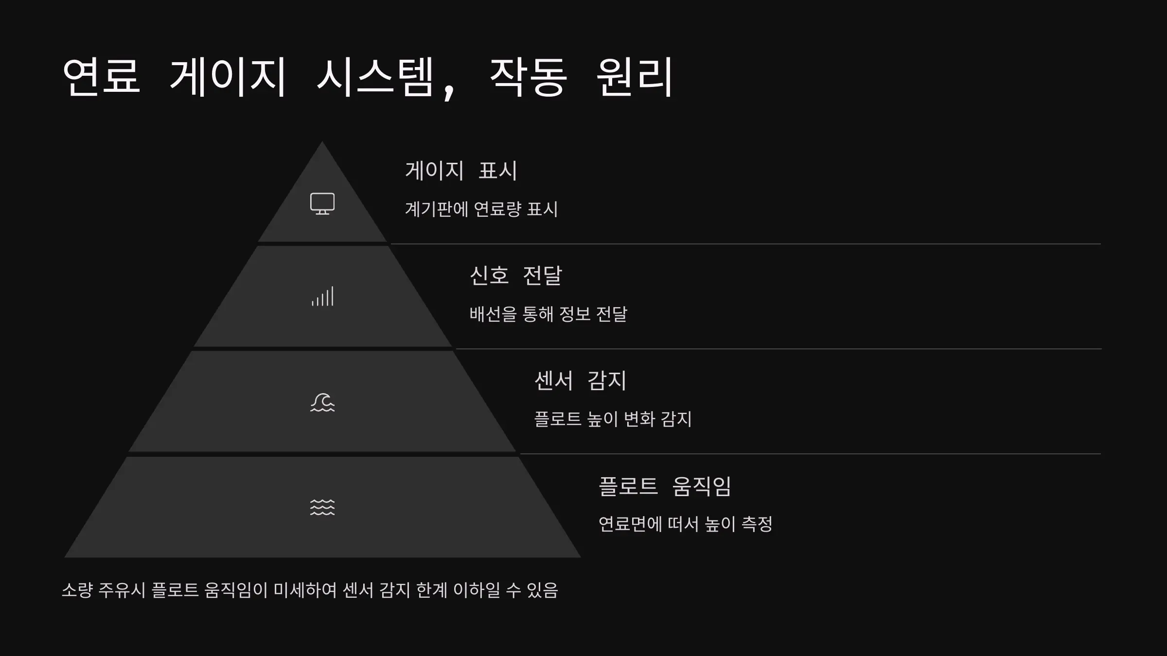 - 대부분 차량은 플로트(부표)가 떠 있는 높이를 센서로 측정해 연료량을 표시합니다.