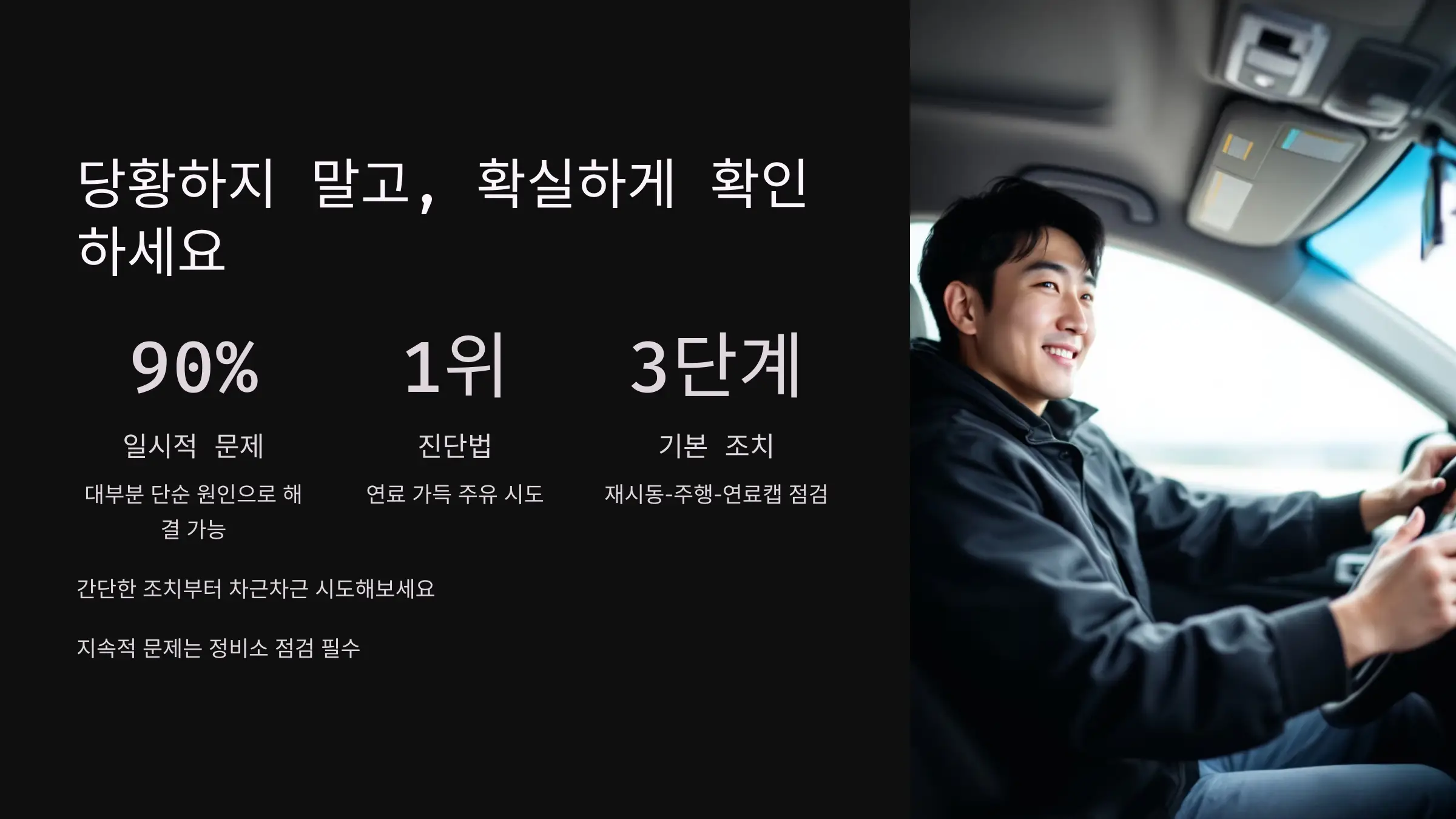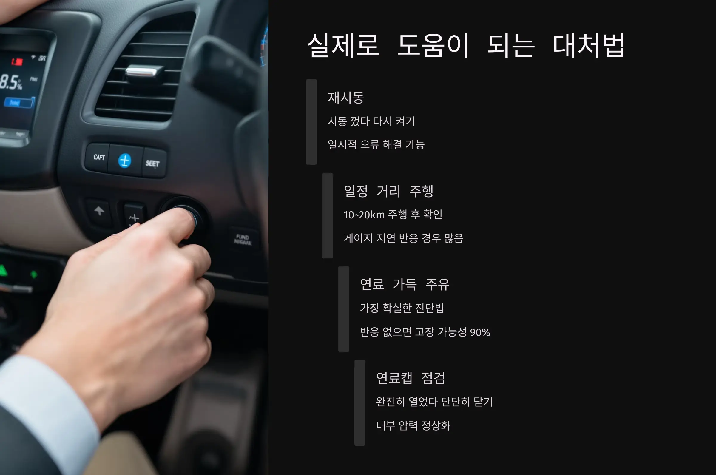 위 모든 방법에도 반응이 없거나 지속적으로 문제가 반복된다면, 반드시 정비소에서 연료계통을 점검받아야 합니다.