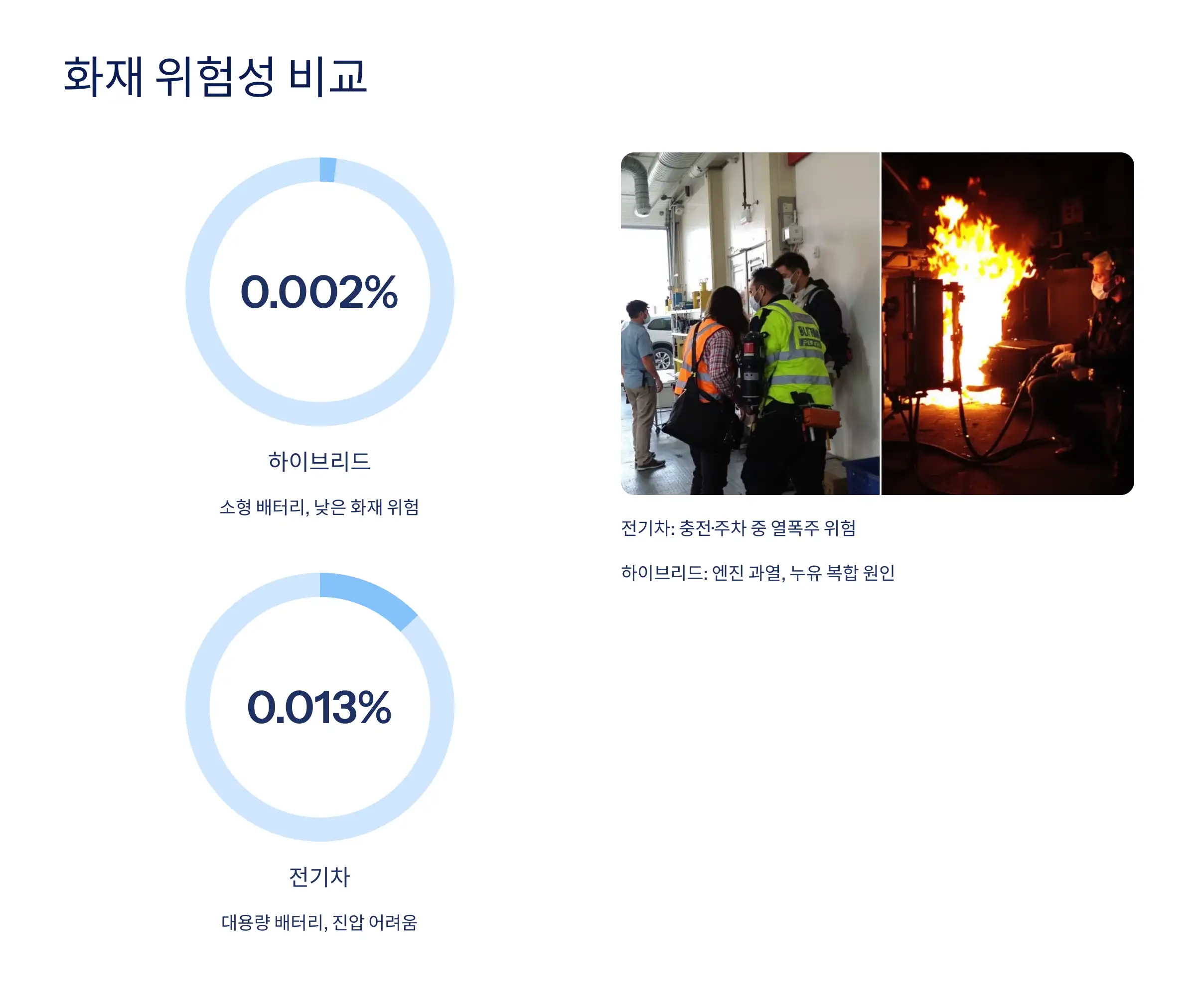 전기차는 대용량 리튬이온 배터리를 사용하기 때문에 화재 발생 시 진압이 어렵고, 피해 규모도 클 수 있습니다. 반면 하이브리드는 배터리 용량이 작고 충전율 제한이 있어 화재 위험이 낮습니다.