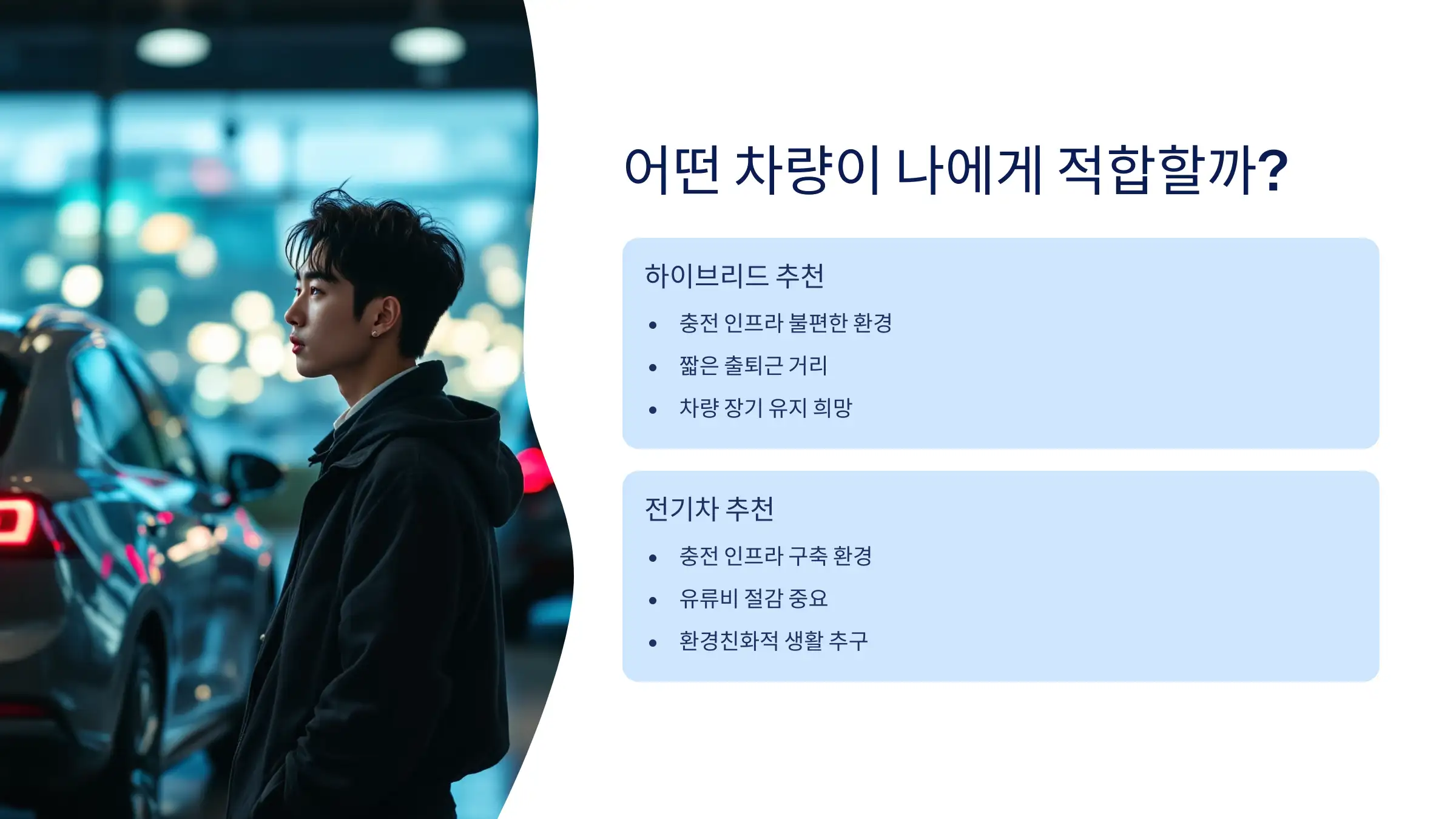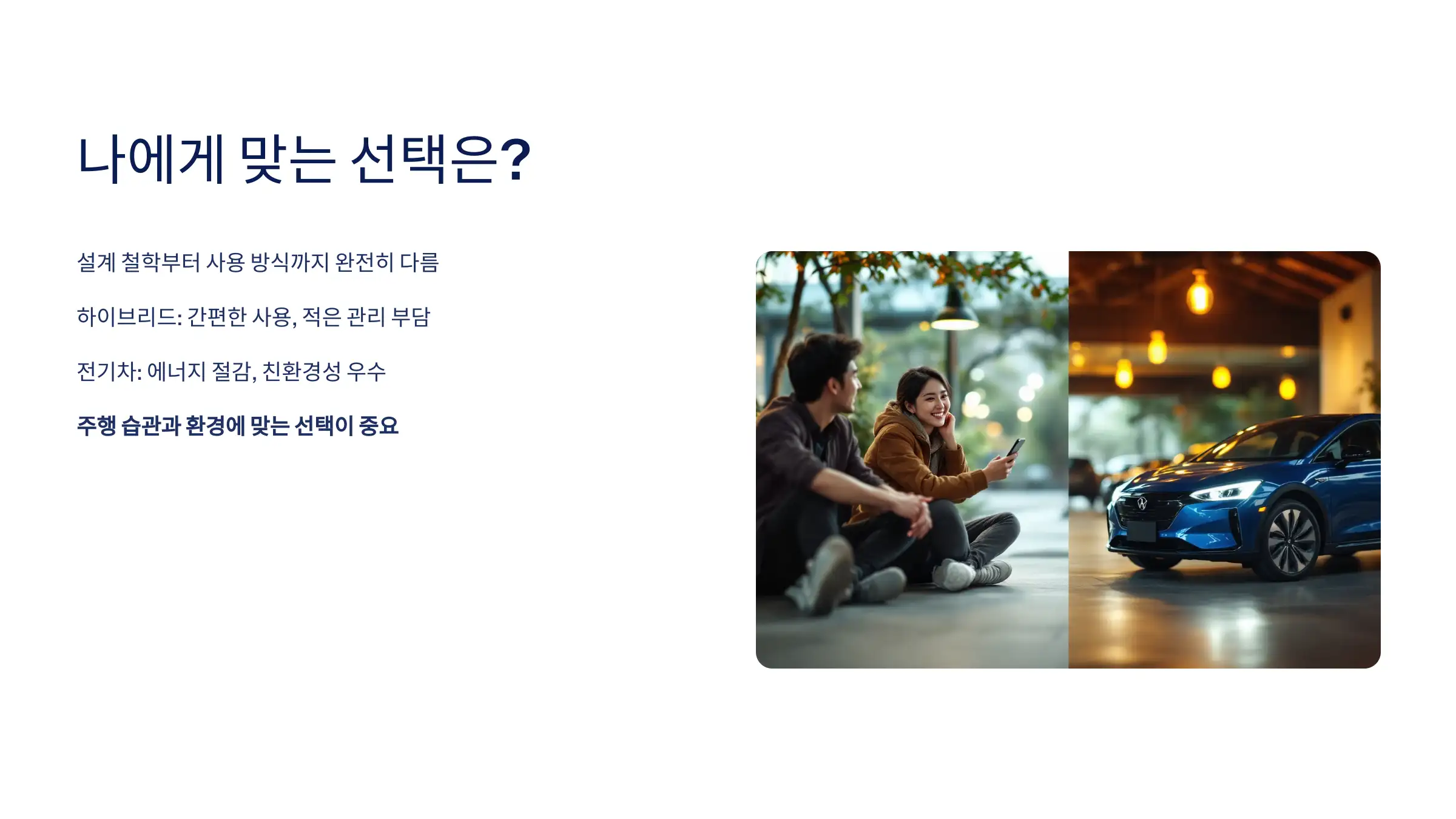 외부 충전 없이 간편한 사용을 원한다면 하이브리드, 에너지 절감과 친환경성에 무게를 두고 싶다면 전기차가 더 적합합니다.