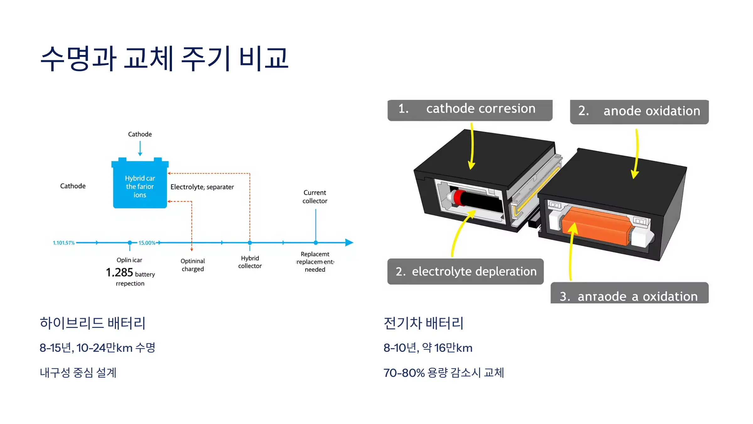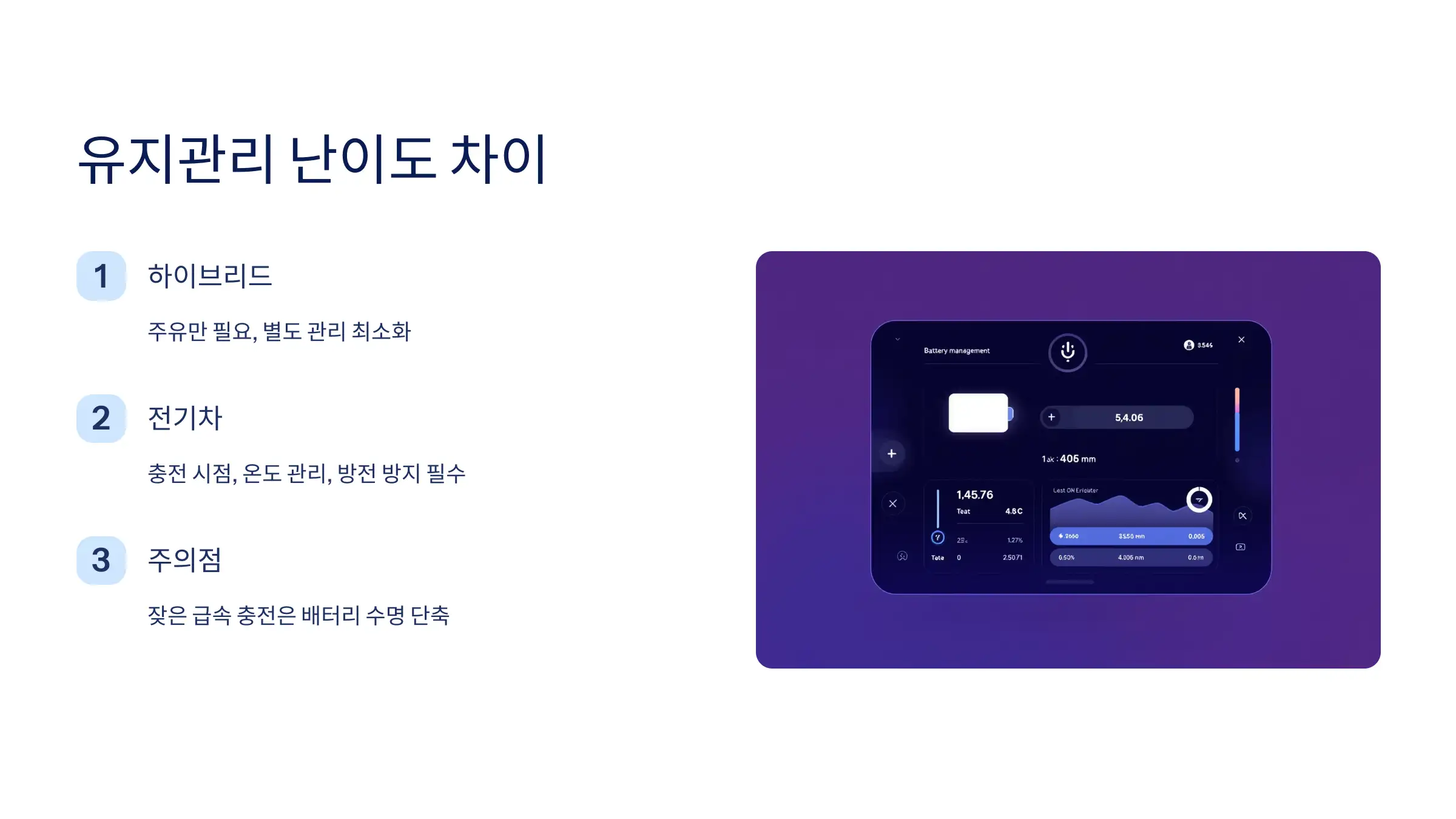 - 반면 전기차는 충전 시점, 온도 관리, 완전 방전 방지 등 배터리 관리가 핵심입니다.