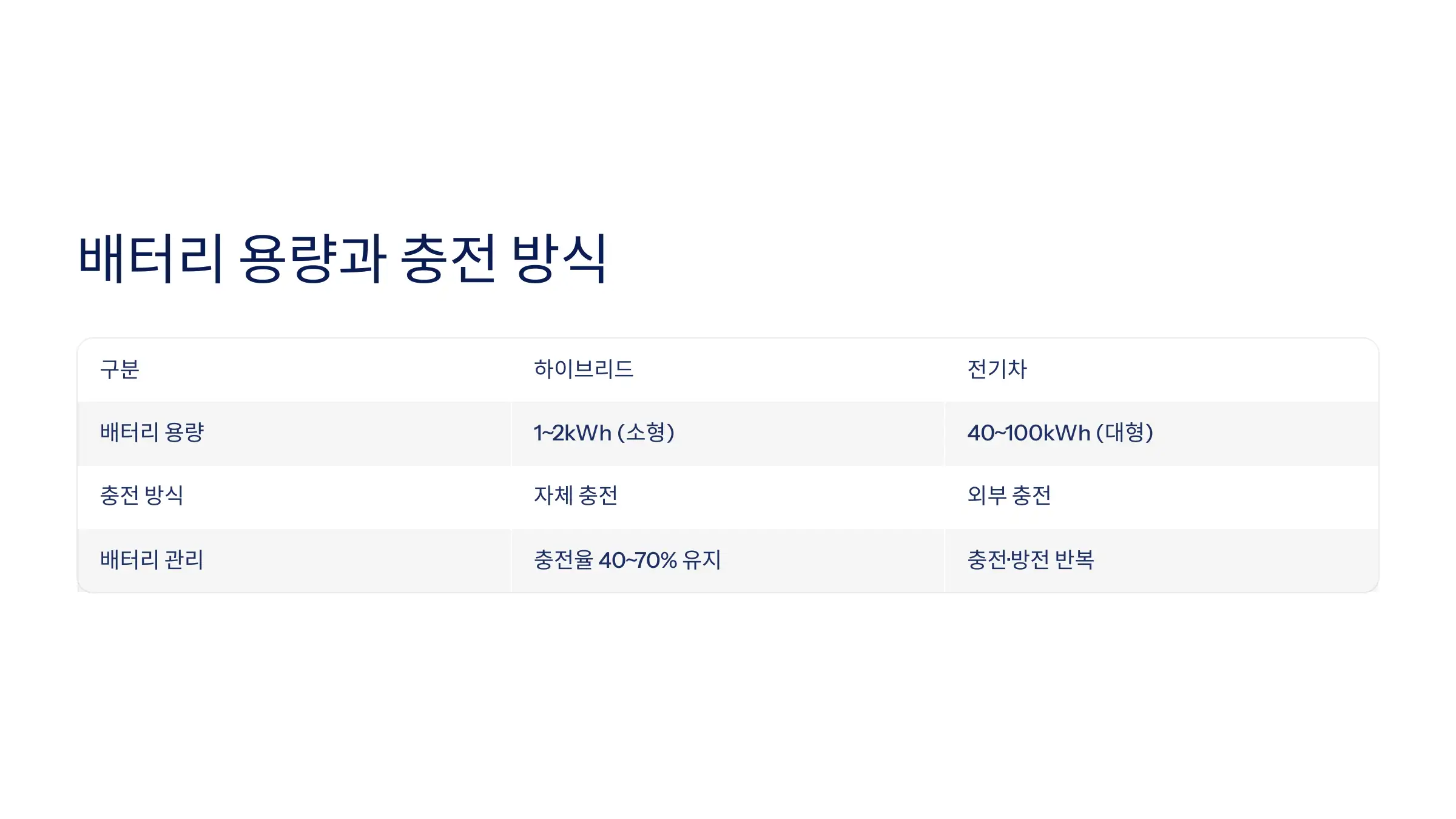 ✅ 하이브리드 배터리는 내구성 중심 설계, 전기차 배터리는 에너지 밀도 중심 설계.