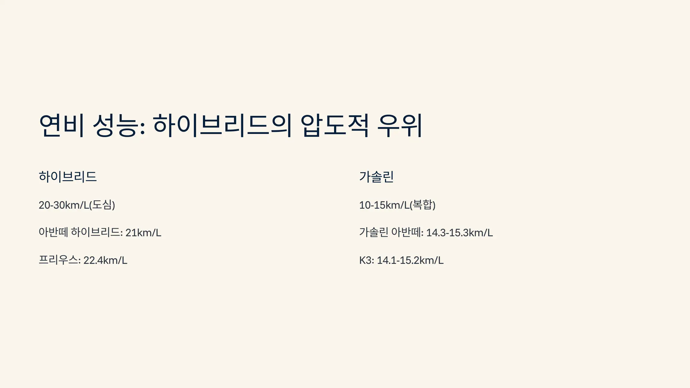 1. 연비 성능: 하이브리드의 압도적 우위