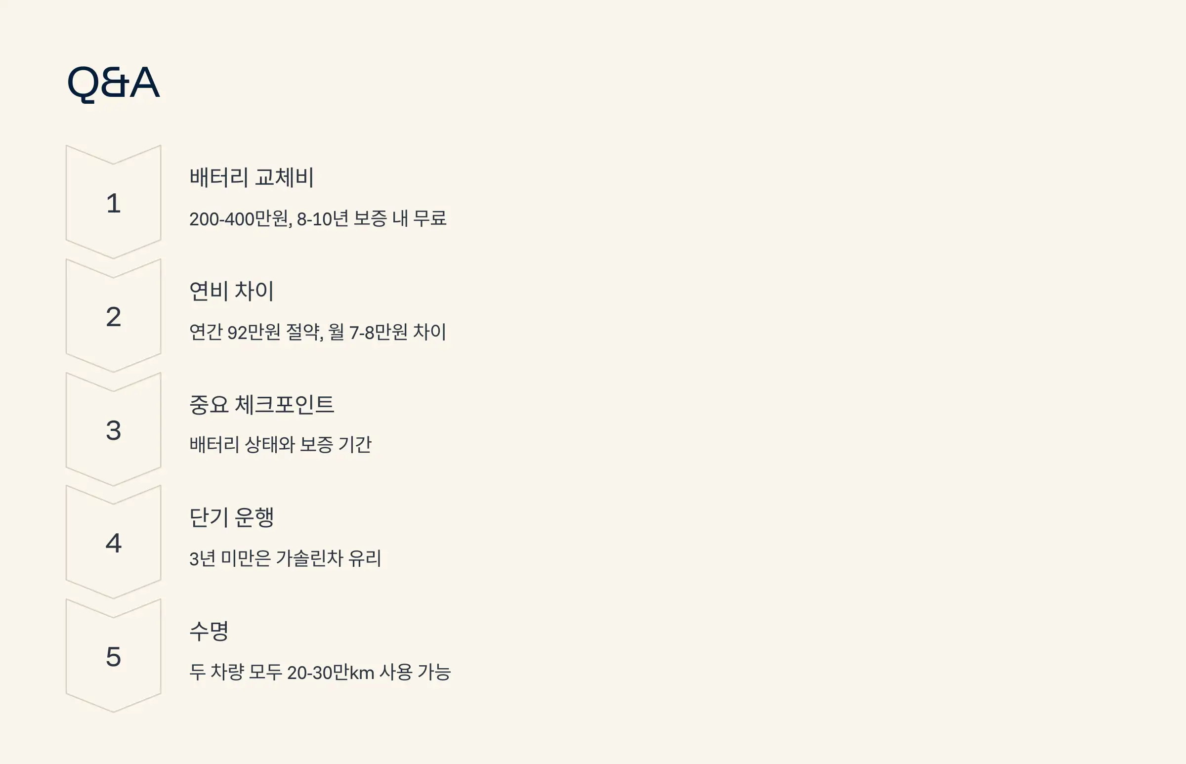 A4. 3년 미만, 5만km 미만의 단기 운행이라면 초기 구매비용이 저렴한 가솔린차가 더 경제적일 수 있습니다.