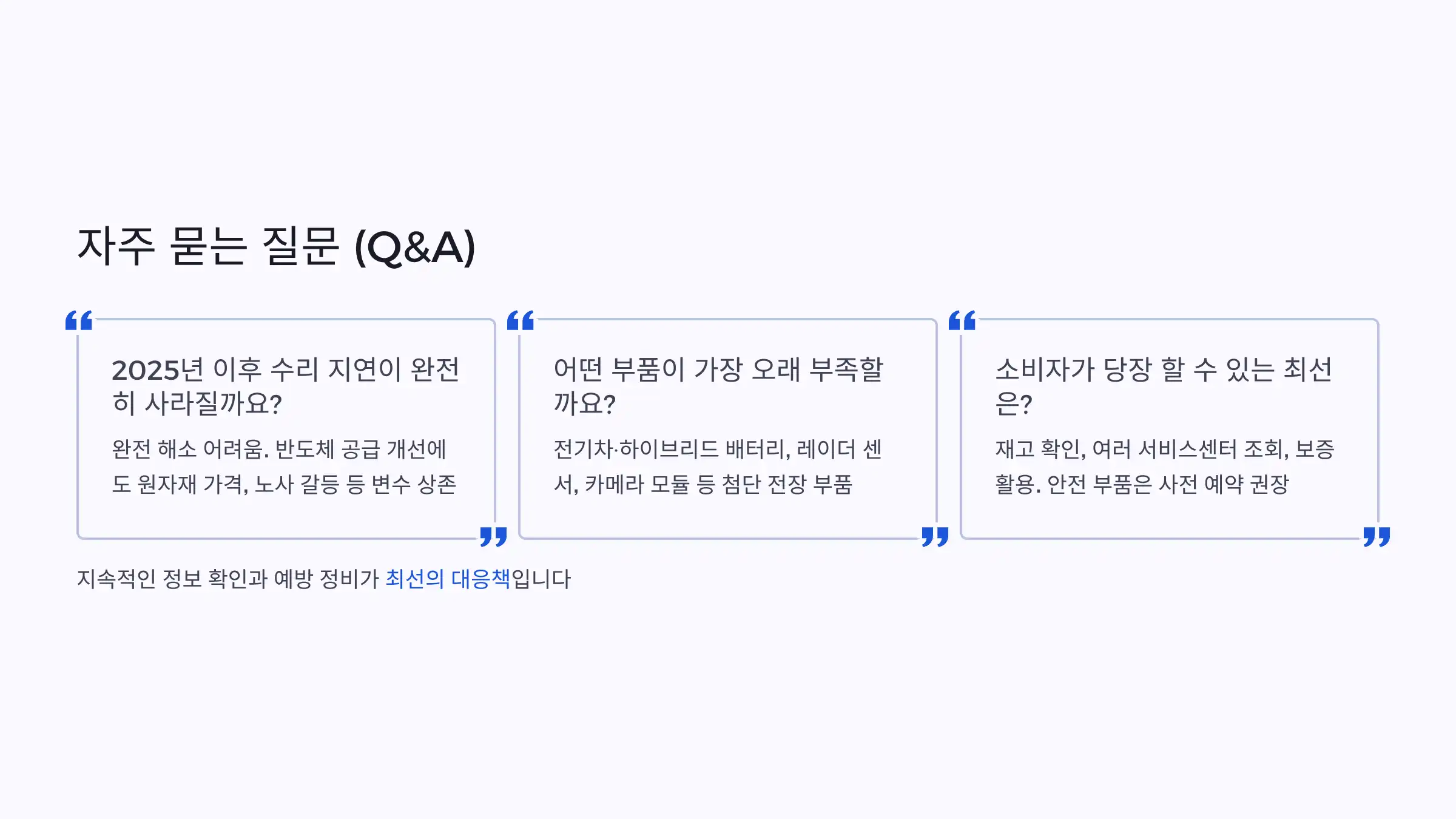 따라서 소비자는 최소 1~2년 이상 수리 지연을 고려한 차량 관리 전략을 세워야 하며, 예방 점검·재고 확인·보증 활용으로 불편을 최소화하는 것이 필요합니다.