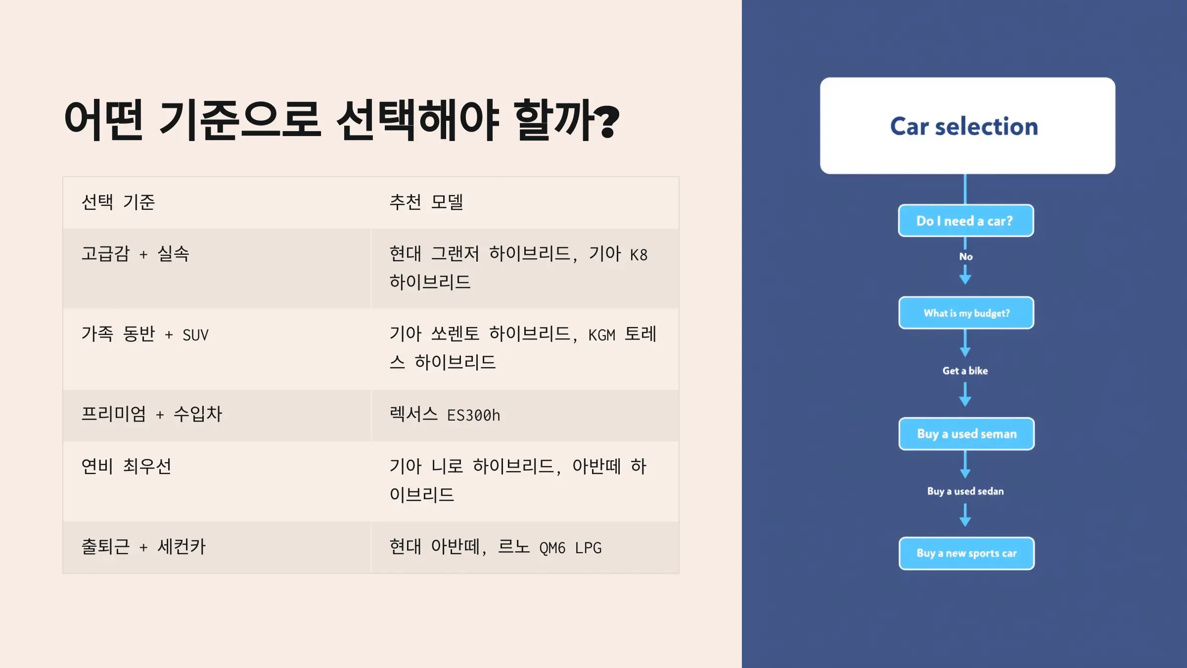 가족과의 시간, 사회적 위치, 효율적인 유지비까지 고려해야 하기 때문입니다.