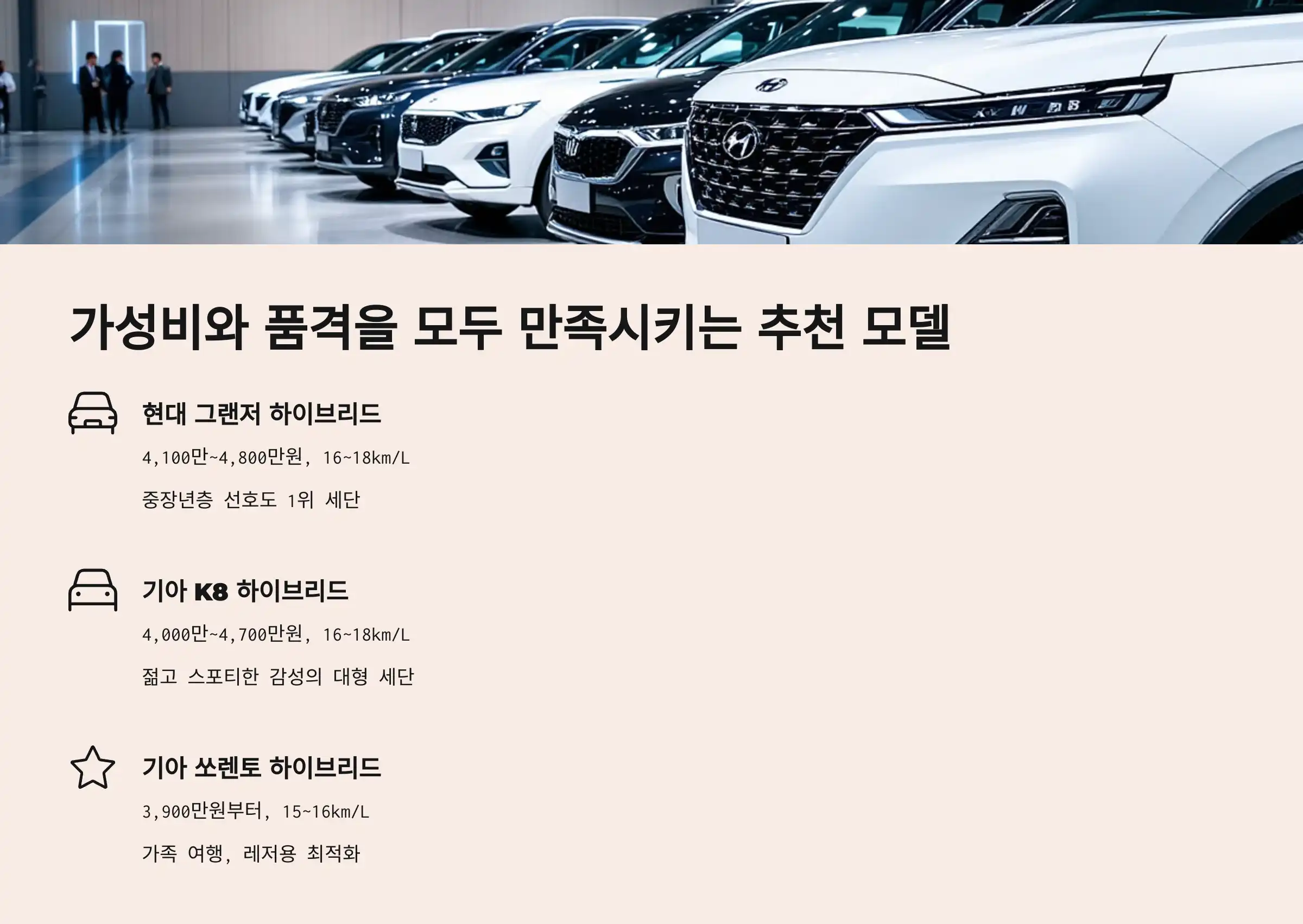 | 고급감 + 실속 | 현대 그랜저 하이브리드, 기아 K8 하이브리드 |