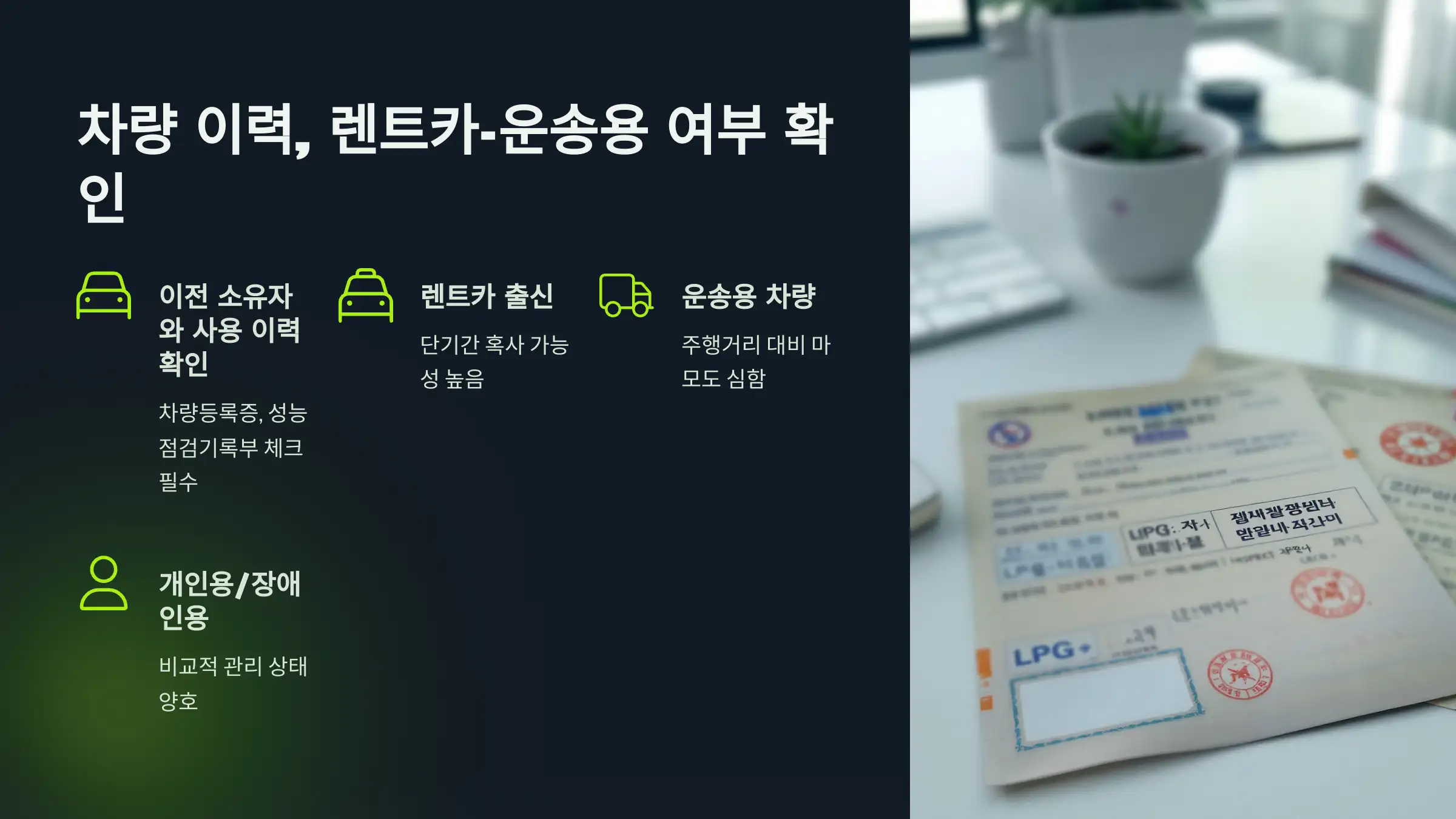 그러나 렌트카 이력, 구조변경, 가스통 상태를 제대로 확인하지 않으면 오히려 큰 수리비 부담과 불편이 생길 수 있습니다.