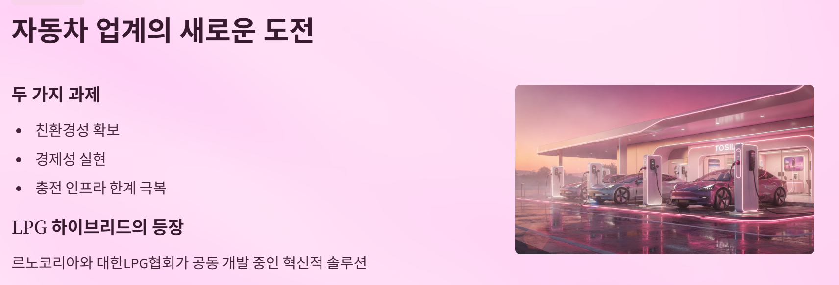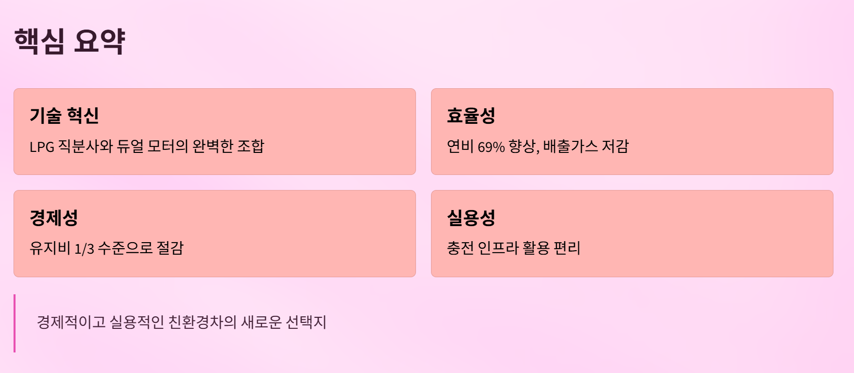 앞으로 LPG 직병렬 하이브리드는 단순한 기술 개발을 넘어, 국내 자동차 시장의 패러다임을 바꾸는 중요한 역할을 할 것으로 기대됩니다.
