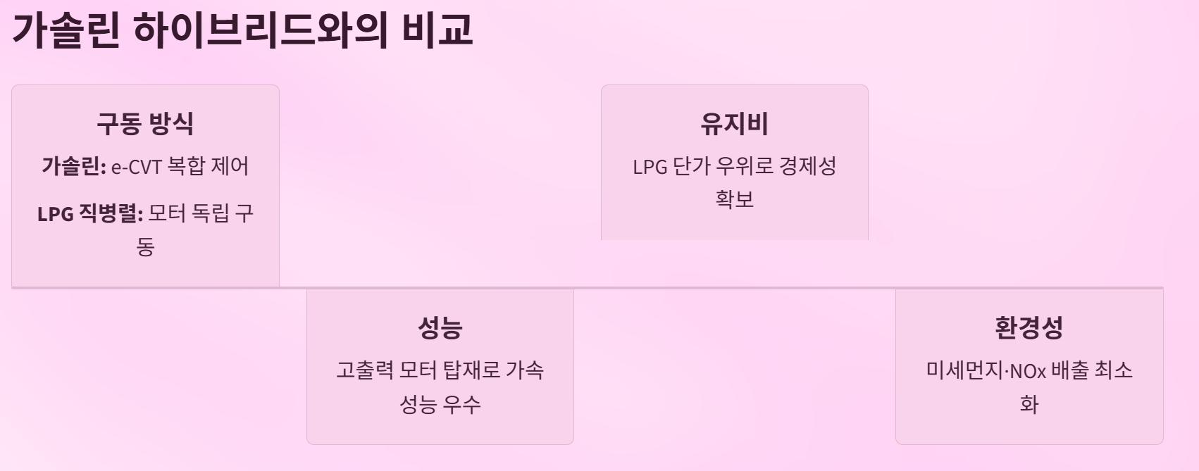 • 구동 방식 : 가솔린 하이브리드는 e-CVT를 통한 복합 제어, LPG 직병렬은 모터 독립 구동으로 더 단순하면서도 효율적.