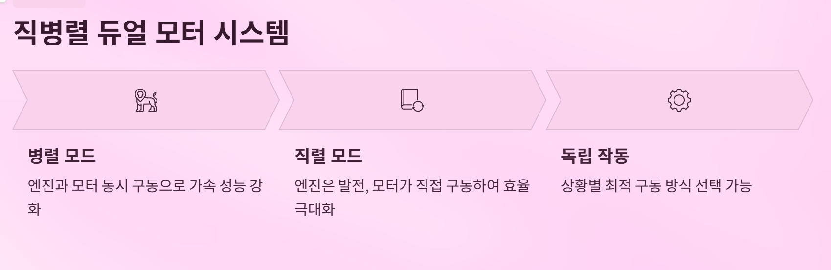 • 병렬(Parallel) 모드 : 엔진과 모터가 동시에 구동해 가속 성능 강화.